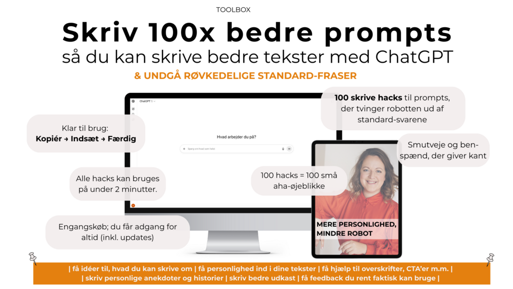 Jeg har samlet 100 af de bedste hacks til at skrive bedre tekster med ChatGPT i et overskueligt bibliotek. Lige til at kopiere og bruge. Så du kan være i gang med skrive bedre med ChatGPT om mindre end 5 minutter. Her er ingen kedelig teori. Ikke noget langt kursus.